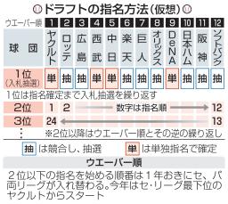 1位指名は入札抽選制で、競合した場合はくじ引きを行い、全球団が確定するまで繰り返す。2位は今季成績で下位球団からの指名となり、今年の優先権を持つセ・リーグの6位ヤクルト、パ・リーグ6位ロッテの順となる。3位指名は折り返して逆の順番となり上位球団から、4位はまた下位からと交互に繰り返して続ける。