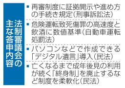 法制審議会(会長・佐伯仁志中央大大学院教授)は12日、刑事裁判をやり直す再審制度に証拠開示ルールを新設する刑事訴訟法の改正要綱を、平口洋法相に答申した。刑訴法の関連規定見直しは1948年の制定から初めて。危険運転致死傷罪の高速度と飲酒の規定に数値基準を設ける自動車運転処罰法改正、「デジタル遺言」導入と成年後見制度の柔軟化をそれぞれ盛り込んだ2件の民法改正の要綱も答申した。