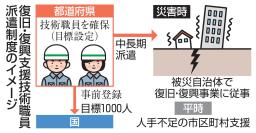 総務省は20年度に「復旧・復興支援技術職員派遣制度」を創設。大規模災害時に1年程度、被災地で業務に就く技術職員を事前に登録する仕組みで、4職種(土木、建築、農業土木、林業)が対象だ。平時は人手不足の市区町村を支援する。各都道府県に職員数設定と人員確保を求めている。