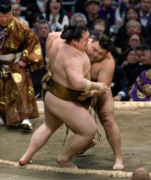 霧島(奥)が寄り倒しで王鵬を破る=エディオンアリーナ大阪