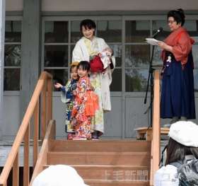 前橋市や上野村などから訪れた人たちが、着物を着て登場。司会が着物にまつわるエピソードを紹介する中、階段を下りると、見物客から拍手が送られた。
