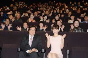 群馬県富岡市が企画製作した映画「紅(あか)い襷(たすき)~富岡製糸場物語~」の同県内での上映が7日、高崎市のイオンシネマ高崎などで始まり、主人公の横田英を演じた水島優さんらが舞台あいさつした。水島さんは観客に撮影秘話を披露し、温かく接してくれた富岡の人々に感謝の気持ちを表した。