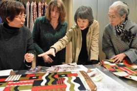V&Aは併用絣の着物や、糸を染める工程で使った型紙などを年度内に永久保存する。V&Aのアナ・ジャクソン東洋部長が25日、保存についての打ち合わせのため、デザインを担当したテキスタイルデザイナー、須藤玲子さんの関わる店舗「NUNO」(東京・六本木)を訪れ、展示時期を伝えた。