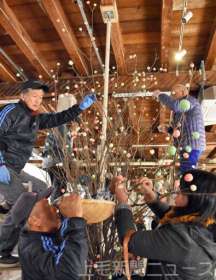 繭玉飾りは繭の豊作を祈願する伝統行事で、かつて養蚕農家が各家庭で小正月に行っていた。米粉を丸めて作った白や緑、ピンク色の繭玉1000個を、会員や観光客が高さ約4メートルのヤマクワの枝先に一つ一つ丁寧に付けた=