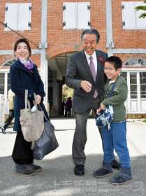 岩井賢太郎市長が出迎え、事務所で歓談した。本田君はシルクのアミノ酸の分子模型や想像して描いた製糸場の絵を披露し、赤れんがの東置繭所の前で一緒に記念撮影した。岩井市長は「来てくれてありがとう。これからも元気で頑張って」とエールを送った。生きた蚕やれんがを間近で見て、座繰りを体験した本田君は「蚕がとてもかわいい。れんがの刻印も見つかった」と目を輝かせていた。