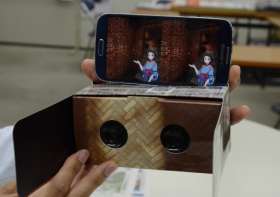 明治期の富岡製糸場を体験できるVRスコープ。スマートフォンをレンズ前に入れて使う