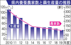 養蚕を巡る担い手不足は深刻だ。県内の養蚕農家は100戸を切る寸前で、10年前に比べて約300戸減った。それでも、個人や企業の新規参入が業界を下支えする。19年度の繭生産量のうち、14年以降に新規参入した23の個人・企業の生産割合は約25%に上る。