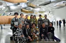 群馬県のいせさき銘仙の会(杉原みち子代表世話人)のメンバーらが13日、東京・六本木の国立新美術館で開催中の展覧会「こいのぼりなう!」を伊勢崎銘仙の着物姿で訪れ、来場者に魅力をPRした。