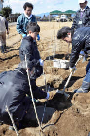 初日は、約15社30人が参加した。県蚕糸技術センターの担当者から指導を受け、深さ30センチに掘った穴に苗木225本を1本ずつ丁寧に植えていった。植樹された苗木がカイコのエサとして使われるまでには、1年余りかかるという。