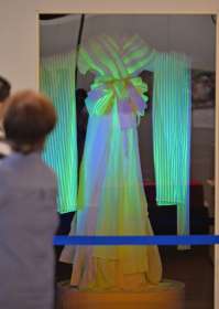 群馬県立日本絹の里の企画展「皇居のご養蚕と養蚕業の歴史・未来」が12月14日まで、高崎市金古町の同館で開かれている。皇室の養蚕の様子を撮影した写真やビデオのほか、暗闇で発光する蛍光絹糸製の十二単(ひとえ)が来場者の目を引いている=写真…