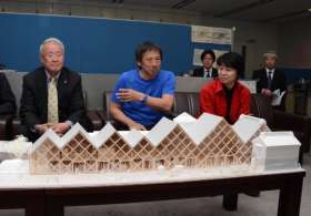 新商工会館の模型を前に記者会見する手塚貴晴さん(手前中央)、由比さん(同右)ら