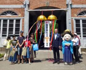 節目に訪れたのは東京都武蔵野市の小沢美香さん(46)。「見学はこれからだけど、建物がすてき」と話していた。くす玉割りや榎本義法市長による記念品贈呈があった=