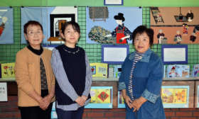 伊勢崎銘仙を使って民話を紹介する大型絵本を作った木村さん(中央)ら