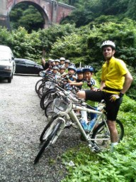 | めがね橋に立ち寄って記念撮影する小学生 |   梅雨が明けない夏休み。そんな天気にめげず、自転車で東京湾から日本海を目指す小学生たちがいる。子供たちを率いるのは英語塾校長のカール・カウアンさん(38)さん=高崎市=だ。「何か大きなことに挑戦してみよう」と2年前、子供たちに東京から上越市までの自転車の旅を提案。東京湾を出発、日本海まで4泊5日かけて走り通すという企画に、4人の小学生が手を挙げた。また、英語塾を運営するうすい学園(高崎市岩押町、柴崎龍吾代表)が全面的に支援してくれた。