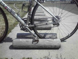 同所の駐輪場は、木枠の間にタイヤを挟むタイプ。木枠の間隔は約10センチ、タイヤとペダルを支点として、バランスを取って駐輪することになる。だが「強風が吹くと倒れた拍子にタイヤのリムがぐにゃりと折れ曲がってしまいそう」と自転車愛好者には人気がない。同所周辺には遮へい物がないのだ。