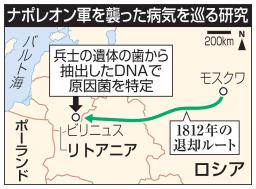 1812年冬、ロシア遠征に失敗し退却するナポレオン1世の軍隊を襲った病気を、兵士の遺体の歯から抽出したDNAの解析で特定したと、フランス・パスツール研究所のチームが24日、科学誌カレントバイオロジーで報告した。発熱や下痢など食中毒症状を起こすパラチフスや、衣服に付くシラミが媒介する回帰熱の原因菌だった。