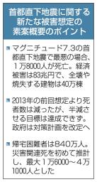政府の有識者会議が近く公表する首都直下地震に関する新たな被害想定の素案概要が5日、判明した。マグニチュード(M)7・3の地震が起きると最悪の場合、1万8千人が死亡し、経済被害は83兆円と推計した。2013年の前回想定から死者数は5千人減、経済被害は12兆円減。住宅の耐震化や火災対策が一定程度進展したことを踏まえた。