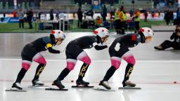 女子団体追い抜きで滑走する(右から)堀川桃香、高木美帆、佐藤綾乃。3位となり、ミラノ・コルティナ冬季五輪の出場権獲得を確実とした=ハーマル(共同)