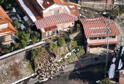 地震の影響で崩れ、道をふさいだ鳥取県伯耆町の石垣=6日午後2時8分(共同通信社ヘリから)