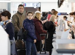 羽田空港の国際線出発ロビーで手続きをする訪日客ら=18日午前