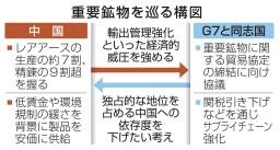 日本政府関係者によると、中国の重要鉱物への関税を上乗せし輸入を抑えることで、中国への依存度を段階的に下げる一方、貿易協定の域内では関税を引き下げる案がある。G7や同志国側で生産する重要鉱物の採算確保を目的に、補助金で支援する制度も検討する。
