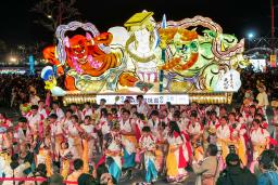 ねぶた師の林広海さん(57)と諏訪慎さん(47)が共同で制作した。林さんは「いい出来になった。本物のねぶたです」と満足げ。諏訪さんは「こちらで寺院にも行ってイメージを固めた」と説明した。制作現場を現地の子どもたちに公開して交流も深めてきた。