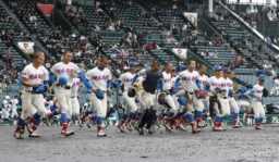 日本文理に勝利し、駆け出す花咲徳栄ナイン=甲子園