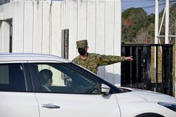 家宅捜索のため陸上自衛隊えびの駐屯地に入る捜査車両=29日午前、宮崎県えびの市