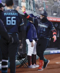 4回、先制本塁打を放ち、ナインに迎えられる日本ハムのカストロ=楽天モバイルパーク
