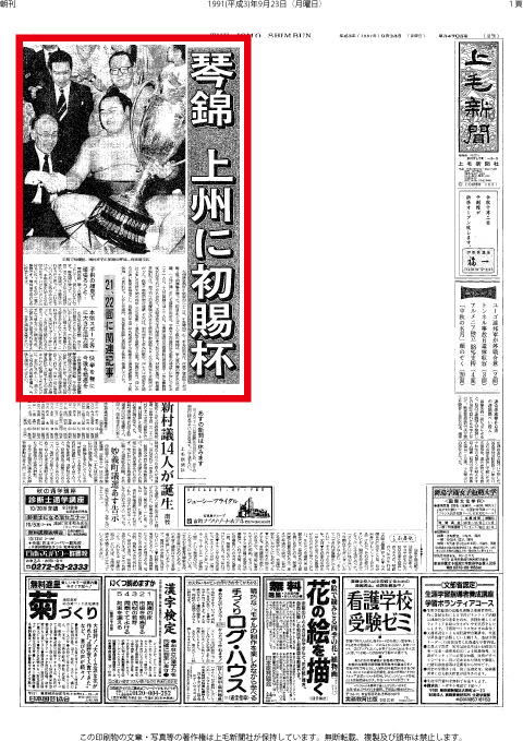 琴錦 上州に初賜杯 1991(平成3)年9月23日
