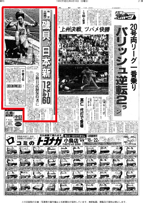 春に群馬大を卒業した磯貝が、走り幅跳び、七種競技と合わせ3種目の日本記録保持者となった。磯貝は富岡東高の2、3年時、走り幅跳びでインターハイを制した。群馬大時代の1987、88年には、走り幅跳び(6メートル58)と七種競技(5537点)で日本記録を樹立。七種競技は95年6月の日本選手権を最後に引退するまで、日本記録を保持した。