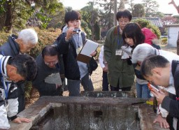 社宅脇の井戸をのぞき込む市民